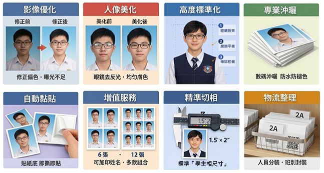 - 人像美化: 基礎人像修飾,如眼鏡反光處理、均勻膚色,使學生容貌自然得體。