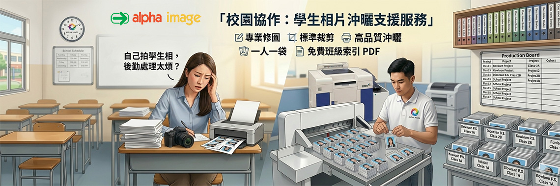 理解校方為方便管理及節省行政開支,常會由教職員自行為學生拍攝相片。然而,後續處理(如修圖、裁剪尺寸、曬相、切相、自動黏貼、包裝)極為耗時。Alpha Image 旨在成為學校的後勤夥伴,提供專業的影像處理服務,並轉化數碼相片為高質素且低成本的實體相片,及提供妥善的分派包裝方案,從而減輕教職員的行政負擔,提升學校行政效率及形象。