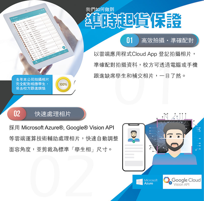 憑著我們20年來不斷創新求進,以獨有的拍攝流程、雲端資料登記系統,和優化管理工序,每年均能準時起貨付運, 學生資料和相片亦配對準確,從來無需校方跟進錯漏。
